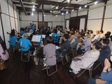 観客は約50人。満席。MCの私「どこでこのコンサートを知ったんですか?」。すると、一人の女性が挙手「私です。元銭湯のものですが、地域に知り合いが多いのでチラシを蒔きました」。そこで、「本当ですか?では、この中で先ほどの方からの案内でここへ来られた、と言う方は?」。挙手したのは数人。やっぱり、満席は謎のまま。