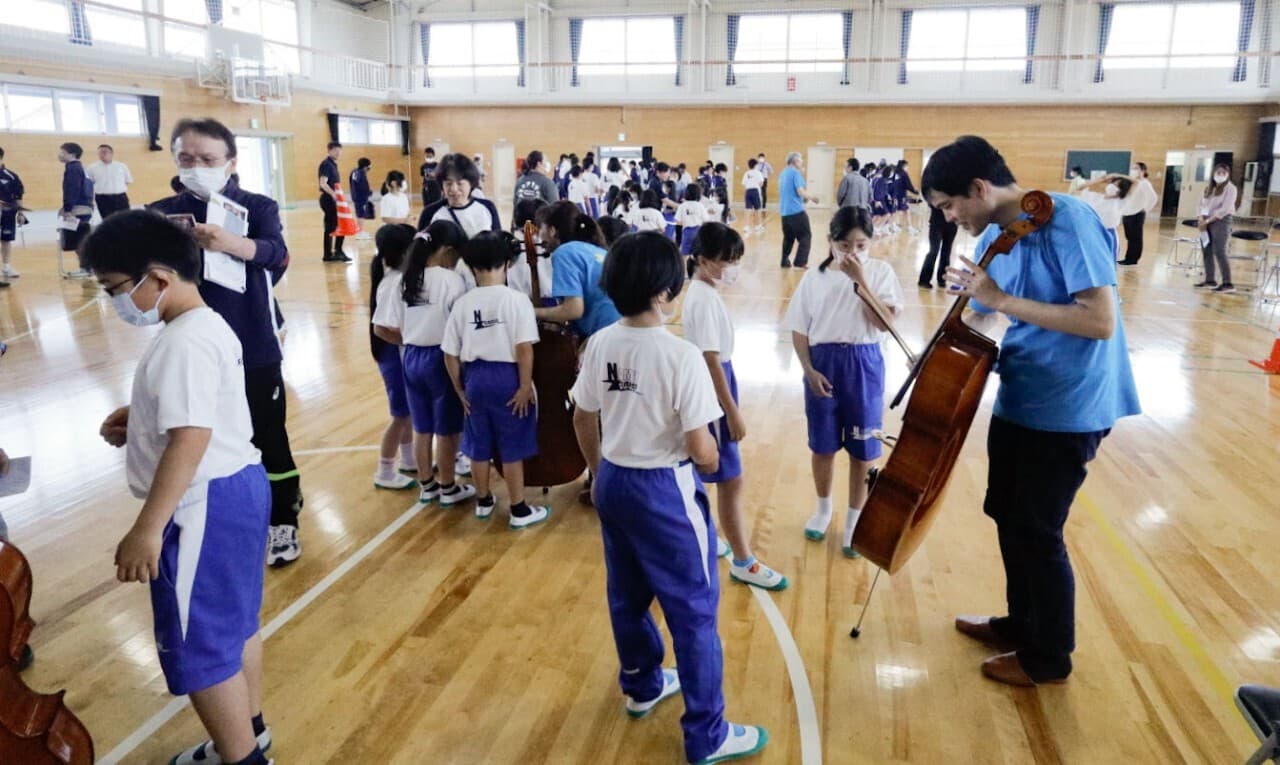 最後に、小学校・中学校の各代表から感想・お礼の言葉をいただいた。「きれいなチェロの音がとても心に響きました。特にさんぽが良かったです!」「とても素晴らしい音色でたいへん感動し、元気をもらいました!指揮の体験も楽しかったです。これからもチェロの音色を多くの人に届けてください。ありがとうございました!」出発までの時間、集合写真の撮影と傾聴を楽しむことができた。