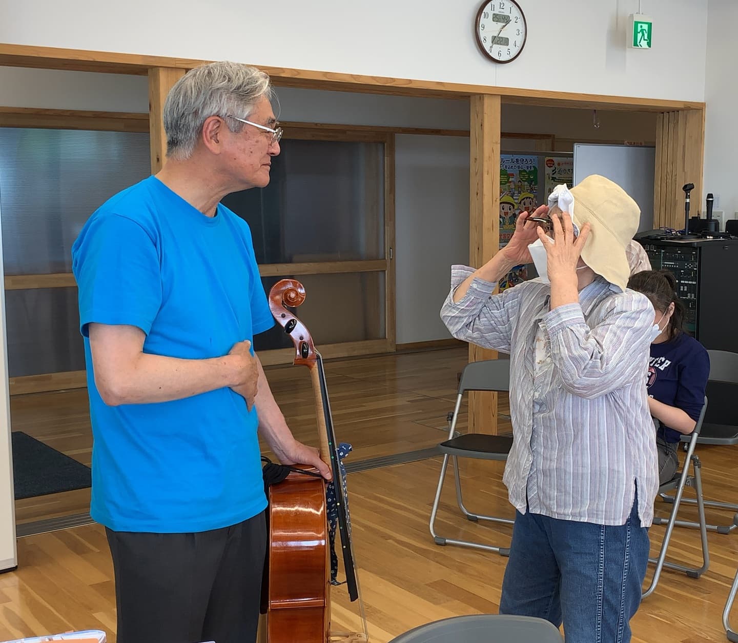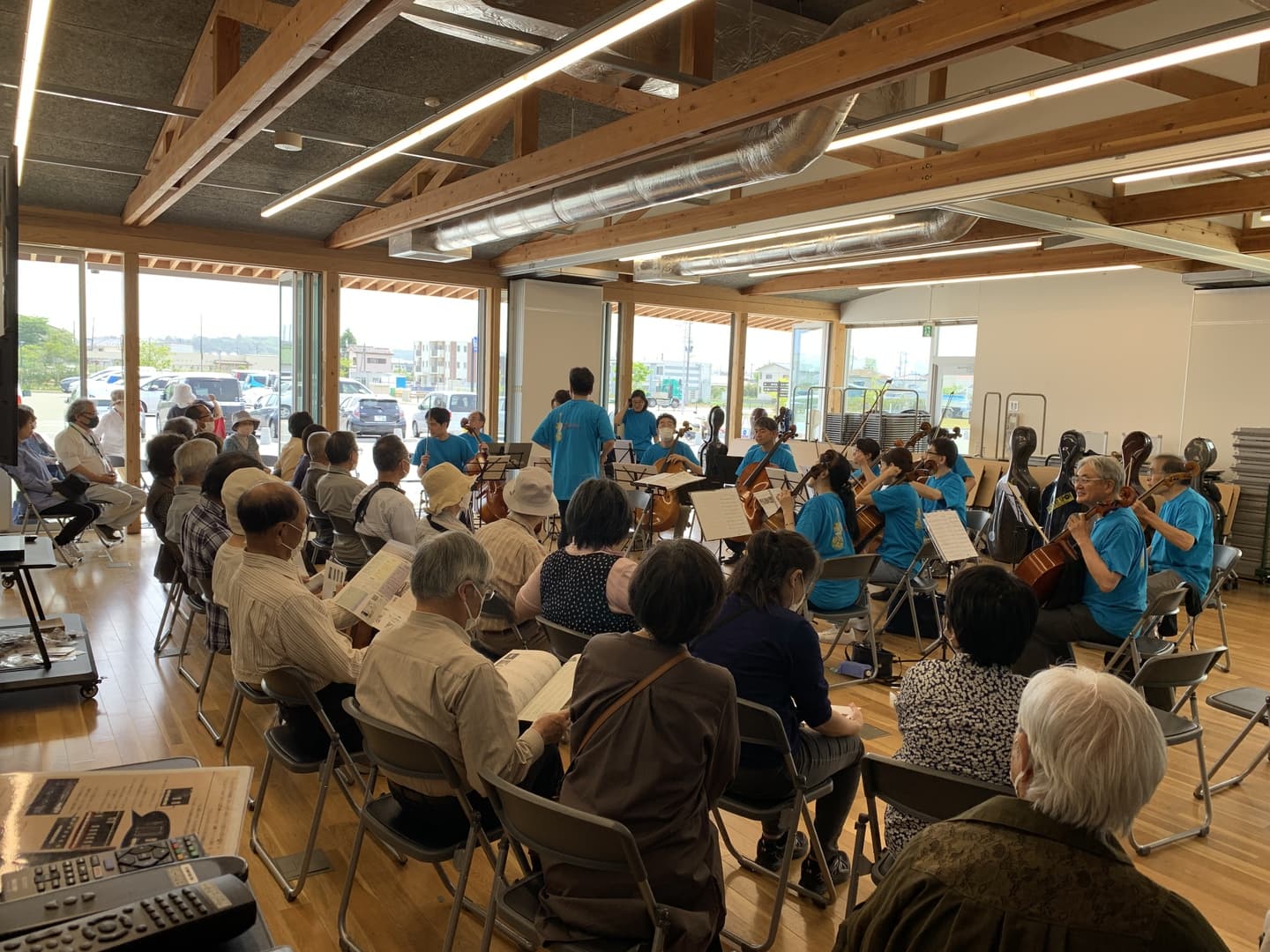 「道の駅」では、「昼食をとるのは演奏が終わってから」とZoom会議の時点でリーダーが決断していただいて、たいへんよかったと思います。会場となった会議室の椅子の配置などの準備をはじめ、全部、自分たちで行なう必要がありましたので、それでも開始時間はジャストのタイミングでした。お客様は、はじめのうちは数人でしたが、続々と来てくださり、椅子を追加で出さざるをえないほどになりました。三枝先生の「チェロのためのレクイエム」は災害地をまわるキャラバンには欠かせない選曲だと思いました。今でも、頭のなかにサビの部分や4番チェロが聴かせなければならないフレーズが浮かびあがってきて、それに浸っております。