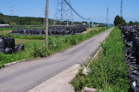 福島県富岡町の畑に「トン袋」の山